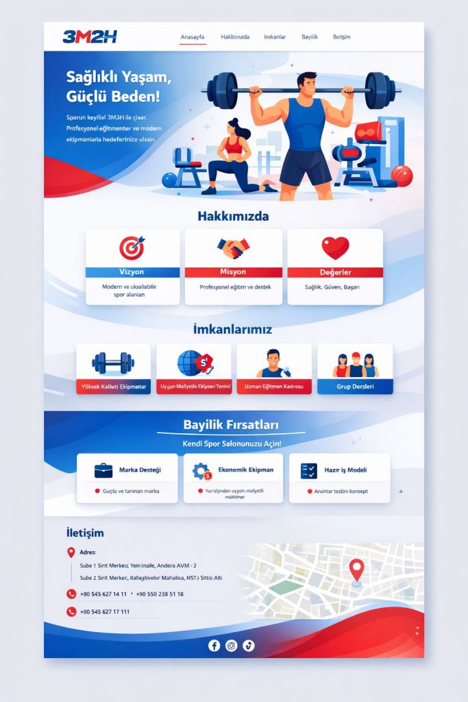 1️⃣ Ana Sayfa / Slider“Sağlıklı Yaşam, Güçlü Beden!”Sporun keyfini 3M2H ile çıkar. Profesyonel eğitmenlerimiz ve modern ekipmanlarımızla hedeflerine ulaş.“Her Seviyeye Uygun Programlar”Başlangıçtan ileri seviyeye, kişiye özel antrenmanlar ve grup dersleri seni bekliyor.“Spor Ailesine Katılın”2 şubemizle her zaman yanınızdayız. Kendinizi iyi hissetmenin zamanı geldi!2️⃣ Hakkımızda3M2H Spor Salonu, spor ve sağlıklı yaşamı herkesle buluşturmayı hedefleyen bir aile işletmesidir. 2 şubemizle hizmet veriyor ve üyelerimizin hem fiziksel hem zihinsel gelişimlerini destekliyoruz.Modern ekipmanlarımız ve uzman eğitmenlerimizle, sporun yaşam tarzı haline gelmesini sağlıyoruz. Spor sadece aktivite değil, 3M2H ile bir yaşam biçimidir! 🌟3️⃣ Vizyon & MisyonVizyonHer bireyin sağlıklı yaşam alışkanlıklarını kolayca benimseyebileceği, modern ve ulaşılabilir spor alanları oluşturmak.MisyonProfesyonel eğitim kadrosu, modern ekipman ve samimi bir ortam ile üyelerimizin hedeflerine güvenle ulaşmasını sağlamak. 💪4️⃣ İmkanlar / AvantajlarımızProfesyonel ve modern makineler – Son teknoloji ekipmanlar. 🏋️♀️Yurtdışından uygun fiyatlarla temin – Kaliteli makineleri ekonomik olarak sunuyoruz. 💸Her seviyeye uygun programlar – Kişiye özel ve grup dersleri.2 şube ve büyüyen aile – Sporun keyfini her yerde yaşayın.Uzman kadro – Deneyimli eğitmenler ile güvenli ve etkili antrenmanlar.5️⃣ Bayilik / Franchise Fırsatları3M2H Spor Salonu olarak büyüyen ailemize katılmak isteyen girişimciler için bayilik fırsatları sunuyoruz.✅ Marka desteği ve eğitim✅ Modern ve kaliteli ekipman temini✅ Hazır iş modeli ve danışmanlık✅ Yurtdışından ekonomik makineler ile maliyet avantajıKendi spor salonunuzu açmak ve 3M2H ailesine katılmak için bize ulaşabilirsiniz